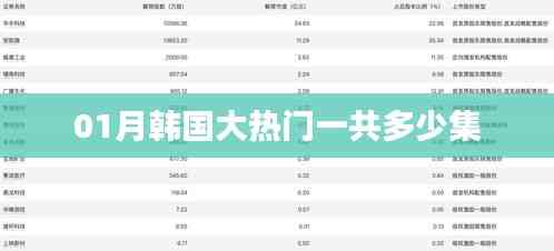 01月韩国大热门》的集数,根据公开资料显示,该剧共有XX集,韩剧的集数有时候会因为编剧和制作方的考虑而有所调整,因此观众在关注剧集的同时,也需要留意官方发布的最新消息。